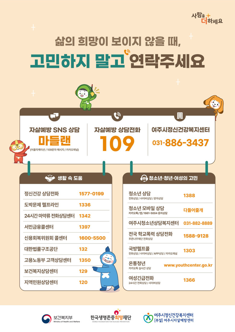 한편, 여주시민은 우울이나 불안 등으로 전문가의 도움이 필요한 경우 자살예방상담전화(109), 정신건강상담전화(1577-0199), 자살예방SNS상담 ‘마들랜’, 여주시정신건강복지센터(부설)자살예방센터(031-886-3437)를 통해 상담을 받을 수 있다.