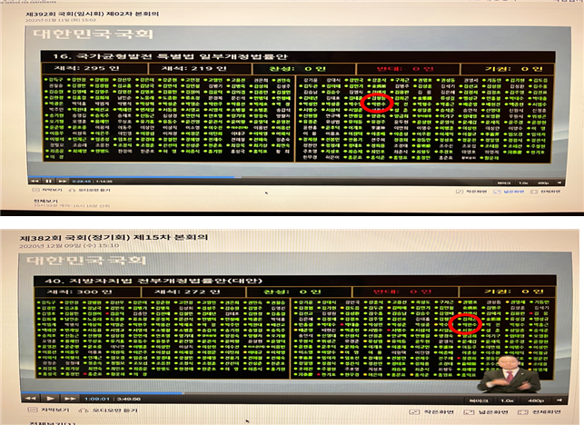 또 박 지사가 국회의원 시절 특별지방자치단체(특별연합)의 법적 근거를 마련하는 지방자치법 전부개정법률안과 국가균형발전법에 모두 찬성한 표결 화면을 공개해 모순임을 주장했다.