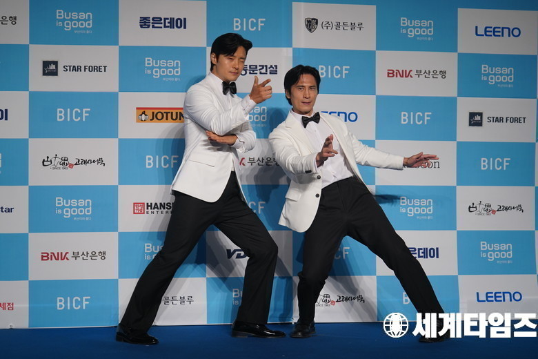개그맨 강완서, 김재우가 29일 오후 부산 해운대구 벡스코 오디토리움에서 진행된 ‘제13회 부산국제코미디페스티벌(BICF)’ 블루카펫 행사에 참석해 포즈를 취하고 있다.