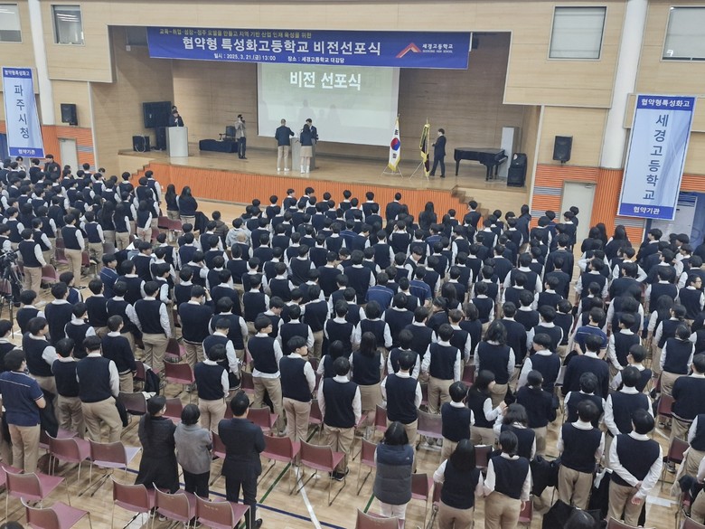 [파주시 세계타임즈=송민수 기자] 세경고등학교(교장 장계홍)는 전교생과 함께 협약형 특성화고 사업에 대한 설명 및 사업 비전 선포식을 21일 실시했다.