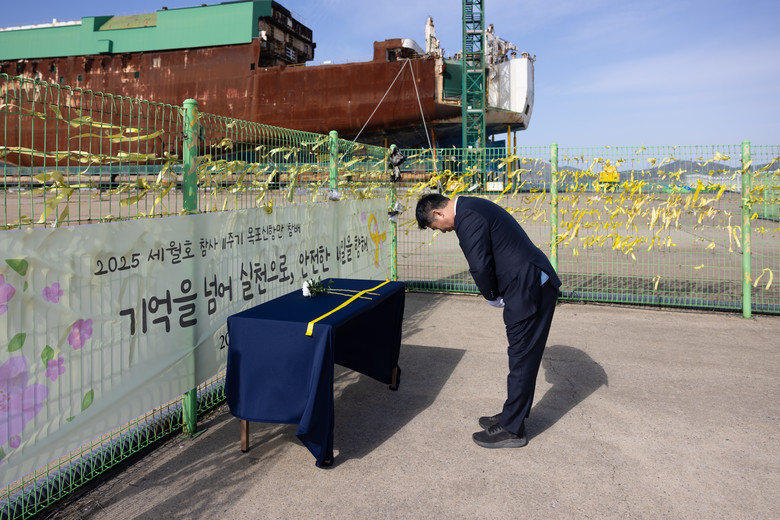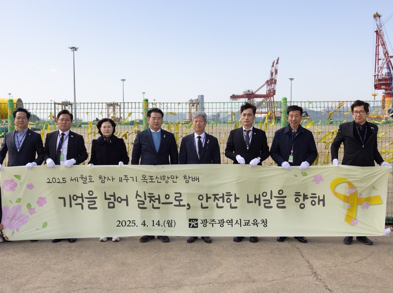 광주시교육청이 14일 목포 신항만 세월호 인근에서 이정선 교육감을 비롯해 고인자 정책국장, 백기상 교육국장, 박준수 행정국장 등 직원들과 함께 세월호 참사 11주기 참배를 진행했다. 이정선 교육감을 비롯한 교육청 직원들은 이날 추도사를 낭독하며, 세월호 희생자를 추모했다. / 제공 광주광역시교육청
