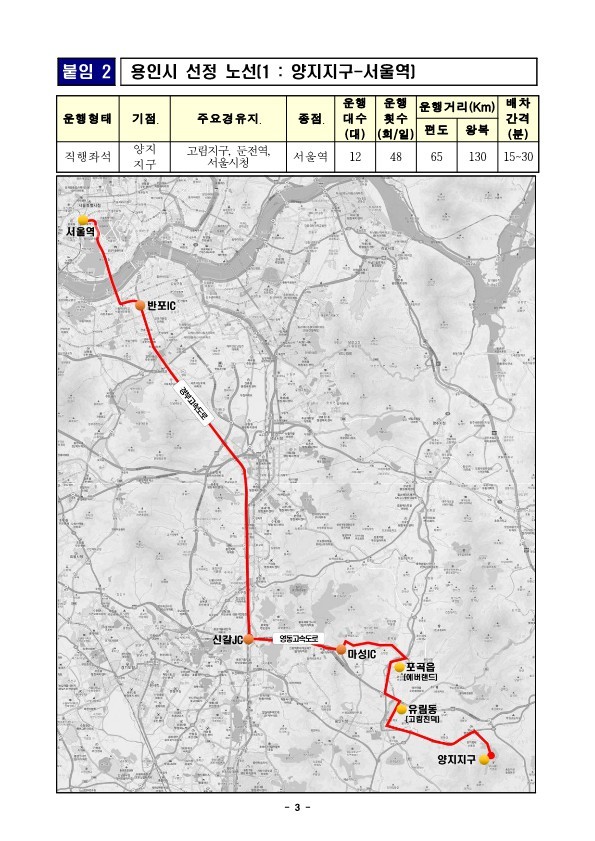 대광위는 ‘25년 광역버스 준공영제 사업으로 경기도에 전환노선 3개와 신규노선 9개 총 12개 노선을 선정했으며, 이 가운데 용인시는 “양지지구–서울역”과 “강남대–서울역” 두 노선이 반영됐다. 양지지구와 강남대 일대는 최근 인구 증가, 교육시설 확충, 산업단지 조성 등으로 광역교통 수요가 빠르게 늘어난 지역으로 서울 도심과의 직결 노선 필요성이 지속적으로 제기돼 왔다.
