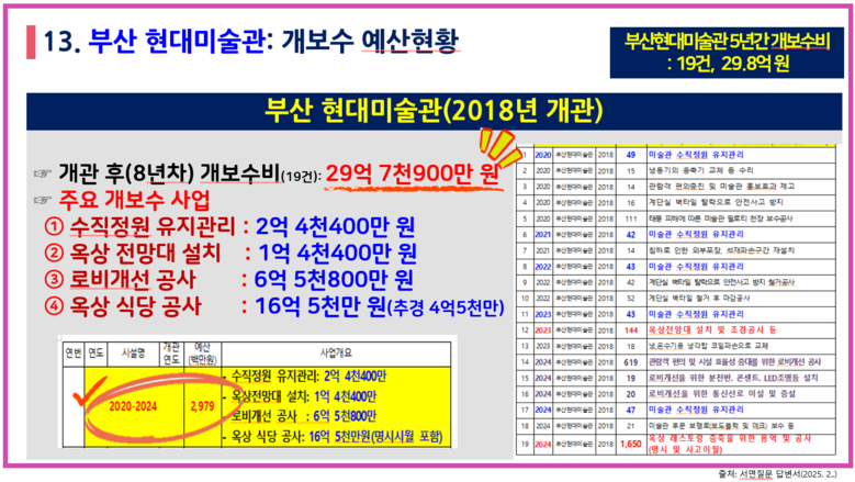 부산현대미술관의 경우 개관 8년 차에 불과하지만 개보수 예산으로 최근 5년간(2020~2024) 30억 원이 사용되었으며, 수직정원 유지관리비 및 옥상 휴게공간 개선 등으로 여전히 개보수비 예산은 지출될 예정이다.