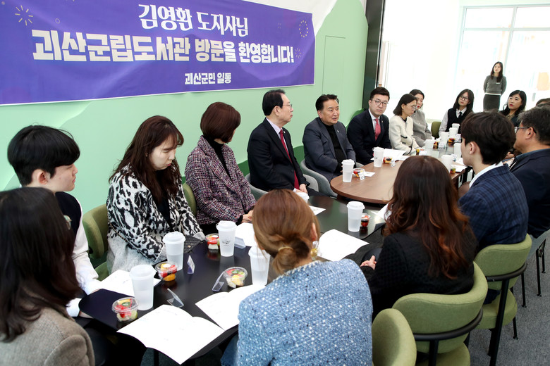 먼저 김영환 지사는 괴산읍에 위치한 괴산군립도서관을 찾아 시설물을 둘러보고 괴산지역의 교육 및 보육관계자 10여 명과 함께 도와 군의 교육 및 보육 정책에 대한 간담회를 가졌다.