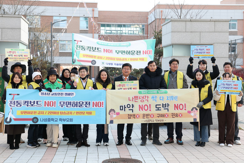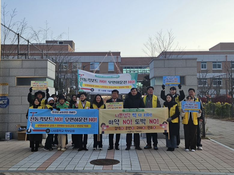 나성중 교사와 학부모는 학생들의 등교 시간에 ‘나쁜 생각 싹 지워’라는 스티커가 붙여진 수정테이프(학용품)를 학생들에게 나눠주고, 피켓으로 학생들을 격려하며 마약, 도박, 전동킥보드의 위험성을 알렸다.