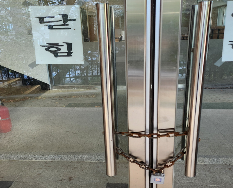 무용지물로 전락한 공립고 기숙사 -폐쇄된 기숙사 입구의 녹슨 쇠사슬- |