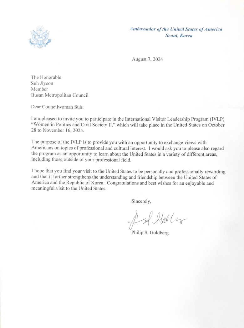 서지연 의원은“한국 대표로 여성 정치 분야를 논할 수 있는 국제지도자 프로그램에 선정되어 기쁘게 생각한다”며 “미국 대선을 현장에서 지켜볼 수 있다는 점도 매우 뜻깊다. 미국과 일본의 국제 활동 경험을 토대로 이번 기회를 통해 부산의 여성 네트워크를 국제적으로 확대하고 한국 정치 발전에도 도움이 될 수 있도록 충분히 학습해오겠다.”고 덧붙였다.