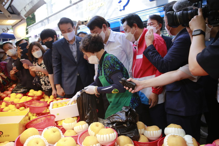 [세계타임즈 이진화 기자]야권 유력대선 후보 국민의힘 윤석열 후보가 추석을 앞두고 경남지역 민심 끌어안기에 방문한 18일 오후 경남 창원 반송시장을 찾아 과일을 사고 있다.