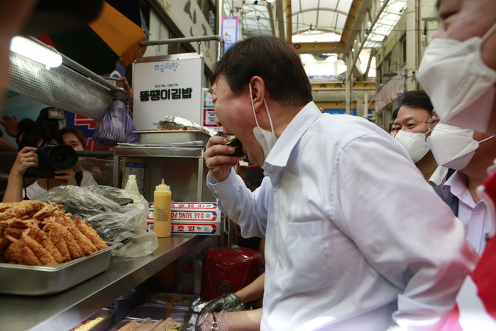 윤석열, 경남 창원 반송시장에서 김밥을 맛보고 있다