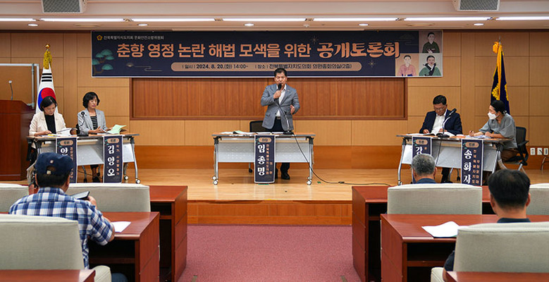 [전북특별자치도의회=세계타임즈 이상호 기자] ‘춘향 영정 논란 해법 모색을 위한 공개토론회’가 전북특별자치도의회(이하 “도의회”) 문화안전소방위원회 주관으로 20일(화), 오후 2시 도의회 의원총회의실에서 개최됐다.