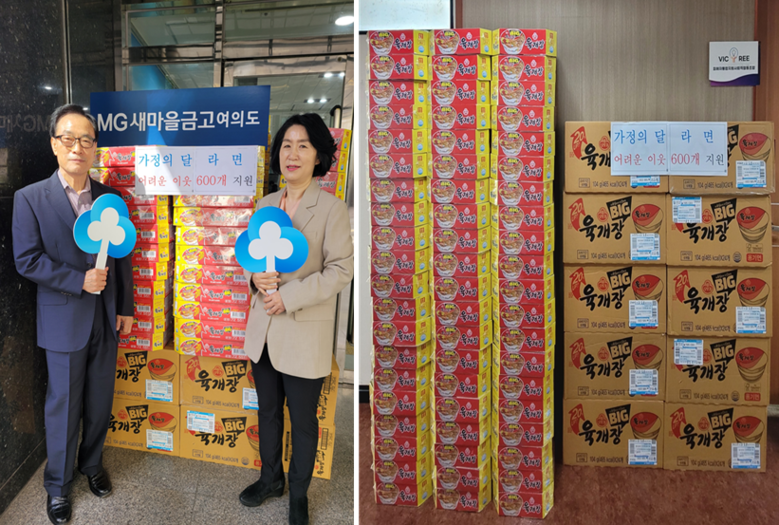 MG새마을금고 여의도 지점은 5월 가정의 달을 맞아 범죄피해 등으로 어려움을 겪고 있는 가정을 위해 지난 18일 피해자통합지원사회적협동조합 ‘빅트리’를 통해 라면 등 어려운 이웃을 위한 후원 물품을 지원했다.