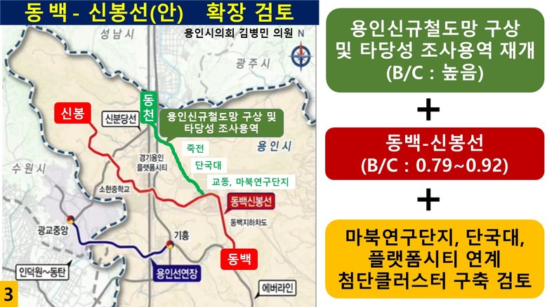 특히, 동천(신분당선)–죽전–마북(교동)–동백 구간과의 연계, 마북연구단지·플랫폼시티·단국대를 잇는 첨단 클러스터 구축 가능성을 종합적으로 검토해 용인시의 신성장동력으로 발전시켜야 한다고 밝혔다.