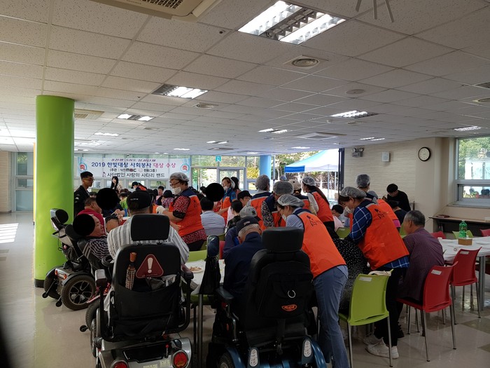[대전=세계타임즈 이장성 기자] 대전시 SNS 봉사단체 사단법인 사랑의 사다리 밴드(리더 이정제)는 27일 오후15시,서구 가수원동에 위치한 행복한우리복지관(관장 강양구)에서 장애인 160명에게 바비큐 통닭 봉사로 우리 사회의 따뜻한 사랑을 실천 하였다.