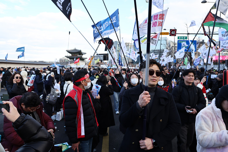 [세계타임즈 = 이장성 기자] 25일 오후 서울 광화문에서 윤석열 즉각 퇴진·사회 대개혁 비상행동 주최로 열린 에서 깃발행진 퍼레이드가 진행되고 있다. 2025.1.25