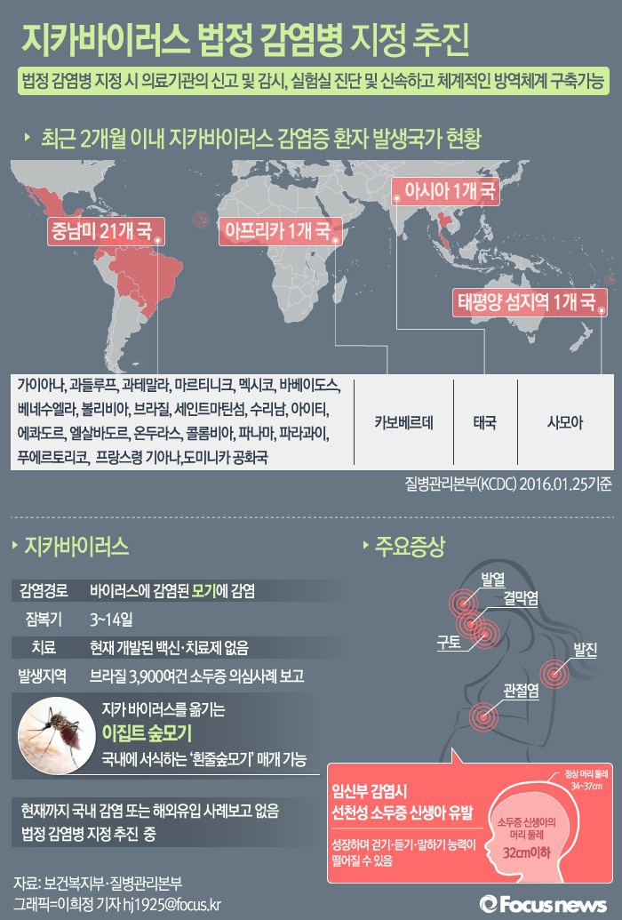 (서울=포커스뉴스) 질병관리본부는 지카바이러스 감염증 발생 국가가 지속적으로 늘어나고 바이러스에 감염된 임신부의 소두증 신생아 출산 가능성이 제기됨에 따라 지카바이러스에 대한 법정감염병 지정 추진 등 대비·대응 태세를 강화시킬 계획이라고 밝혔다. 지카바이러스 감염증이 법정감염병으로 지정되면, 의료기관의 신고 및 감시, 실험실 진단이 체계적으로 갖춰지게 된다.