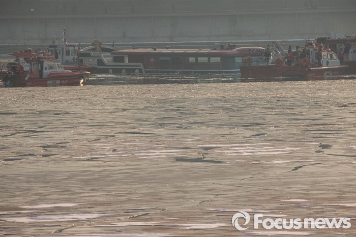 (서울=포커스뉴스) 26일 오후 서울 한강 영동대교 인근을 지나던 한강유람선이 침수, 구조대원들이 구조활동과 견인 작업을 하고 있다.