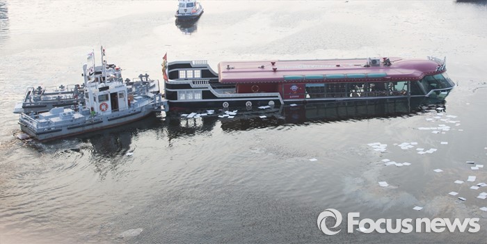 (서울=포커스뉴스) 26일 오후 서울 한강 영동대교 아래에서 소방대원들이 침수된 한강유람선 견인 작업을 하고 있다.