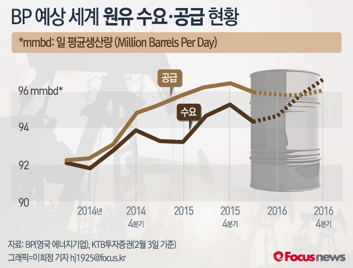 이충재 KTB투자증권 연구원은 “올해 들어 미국 석유 생산량 감소가 두드러지게 나타나고 있다”며 “미국 셰일 오일의 생산량 감소가 올해 세계 석유 시장의 가장 큰 변수가 될 것”이라고 예상했다.(서울=포커스뉴스) 영국 에너지기업 BP가 예상한 바에 따르면 2016 하반기부터 세계 원유 생산량 감소로 수요와 공급의 격차가 줄어들어 원유값이 안정될 것으로 예상된다. 2016.03.09 이희정 기자