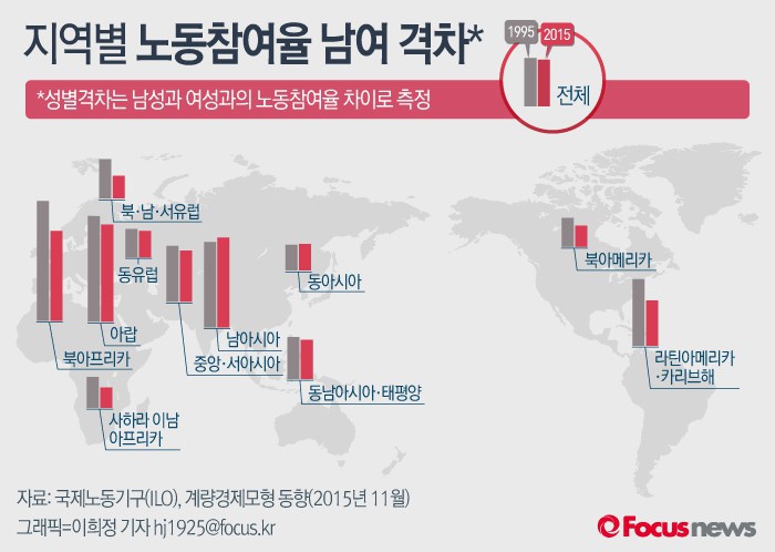 (서울=포커스뉴스) 국제노동기구(ILO)의 '2016 여성노동 동향 보고서'에 의하면 1995과 2015년 노동참여율의 격차 차이가 크지 않은 것으로 나타났다.