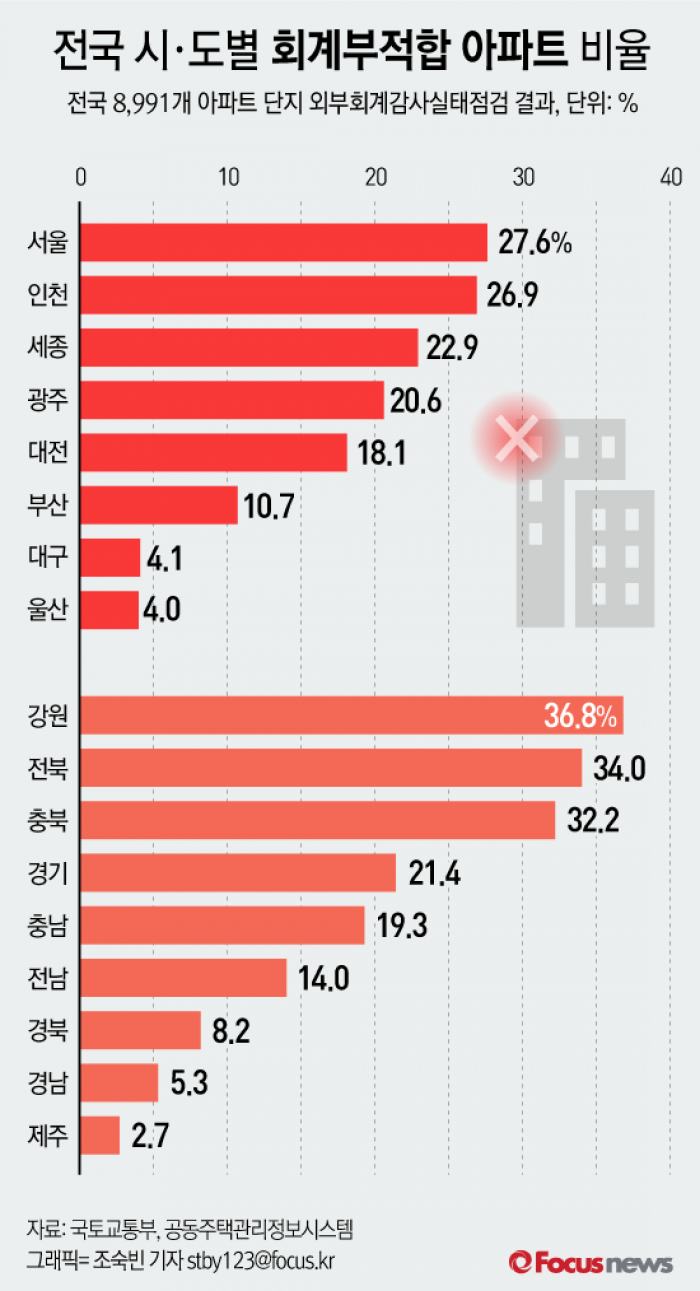 | △ [그래픽] 전국 시·도별 회계부적합 아파트 비율 |