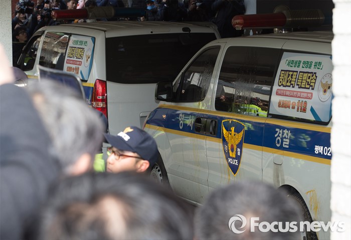 (평택=포커스뉴스) 학대와 무관심 속에 살해당한 신원영 군의 계모 김모 씨와 친부 신모 씨가 14일 오후 경기도 평택시 포승읍 자택에 도착, 기다리던 시민단체 회원들과 시민들이 던진 계란 흔적이 호송차량에 남아 있다.
