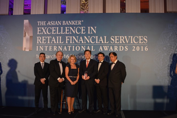 아시안뱅커지는 싱가포르에 본사를 두고 있는 금융분석 기관으로 매년 리테일뱅킹 부문의 핵심상품 시장점유율, 리스크와 같은 재무성과와 핵심전략, 상품, 서비스 등 비재무성과에 대한 평가를 실시해 국가별 최우수 은행을 선정하고 있다.지난 16일 홍콩에서 열린 아시안 뱅커(The Asian Banker)誌 주최 EXCELLENCE IN RETAIL FINANCIAL SERVICES INTERNATIONAL AWARDS 2016 행사에서 최재열 신한아주금융유한공사 사장이(왼쪽부터 네번째) 2016년 대한민국 최우수 리테일 은행상 수상 후 Asian Banker誌 관계자들과 함께 기념촬영하고 있는 모습.<사진제공=신한은행>