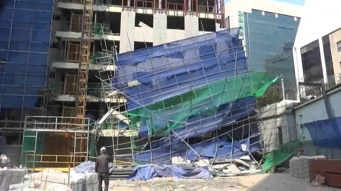 (서울=포커스뉴스) 20일 오후 1시 10분쯤 서울 중구 다동의 한 건물 리모델링 공사장에서 비계(외벽공사를 위한 임시가설물)가 붕괴되는 사고가 발생했다.
