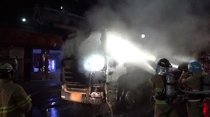 (서울=포커스뉴스) 28일 오전 4시 53분쯤 서울 동대문구 답십리동 한 도로변에 정차 중이던 덤프트럭에서 불이 나 엔진과 운전석 일부를 태우고 오전 5시 1분 출동한 소방관들에 의해 꺼졌다.