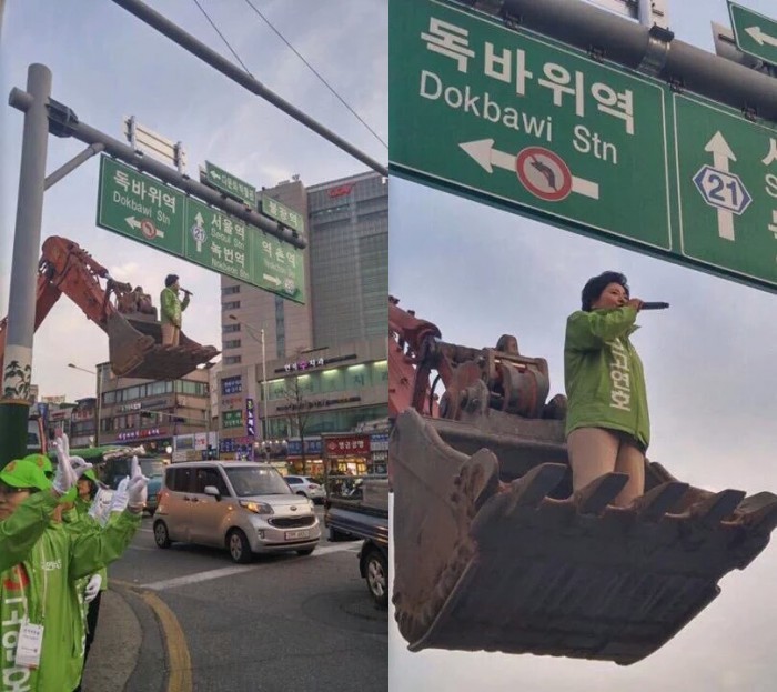고 후보 선거사무소 관계자는 "고 후보가 중장비대여업체 출신이어서 포크레인을 대동한 것“이라며 "평소 여자로서 종사하기 힘든 업계에서 일해 왔던 거에 자부심이 강하다보니 버켓에 오른 것 같다"고 설명했다.서울 은평을 고연호(국민의당) 후보가 31일 서울 은평구 불광역 부근에서 포크레인 위에 올라 연설 유세 중이다. <사진제공=온라인 커뮤니티>