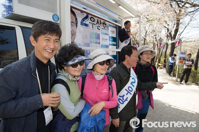 (서울=포커스뉴스) 11일 오후 서울 서대문구 청소년수련관 앞에서 우상호 더불어민주당 서대문구갑 후보가 영화배우 안내상, 우현과 함께 유세를 하고 있다.