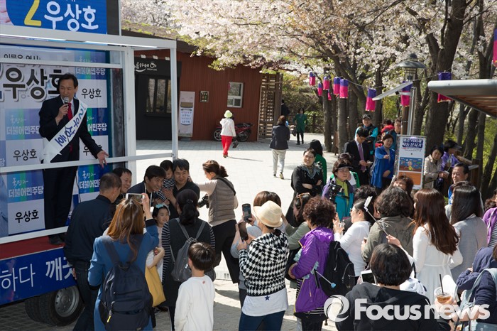 (서울=포커스뉴스) 11일 오후 서울 서대문구 청소년수련관 앞에서 우상호 더불어민주당 서대문구갑 후보가 영화배우 안내상, 우현과 함께 유세를 하고 있다.