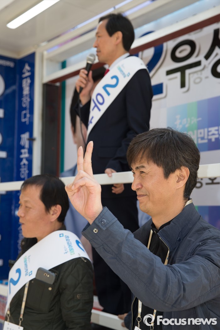 (서울=포커스뉴스) 11일 오후 서울 서대문구 청소년수련관 앞에서 우상호 더불어민주당 서대문구갑 후보가 영화배우 안내상, 우현과 함께 유세를 하고 있다.