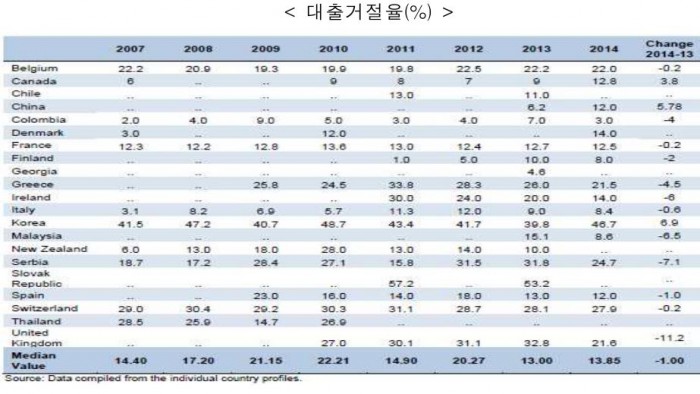 보고서에 따르면 대다수의 국가에서 중소기업 대출승인 거절율이 2007년 이후 하락하는 추세였으나 한국은 2014년 중소기업 대출승인 거절율이 절반에 가까운 46.7%로 수치가 제시된 국가 중에 가장 높았다.