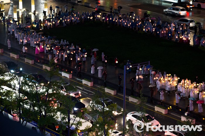 (서울=포커스뉴스) 20일 오후 서울 종로구 광화문 광장에서 부처님오신날(5월 14일)을 앞두고 봉축행사의 일환인 '사사자 삼층석탑등 점등식'이 열리고 있다.