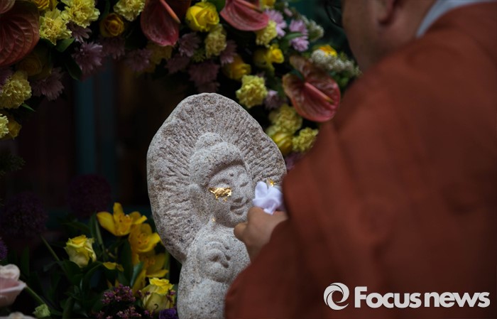 (서울=포커스뉴스) 21일 오전 서울 종로구 조계사에서 금박공양 의식이 진행되고 있다.