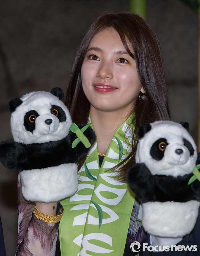 (용인=포커스뉴스) 21일 오전 경기도 용인시 에버랜드에서 열린 '판다월드 개관식'에서 미쓰에이 수지가 기념촬영을 하고 있다.