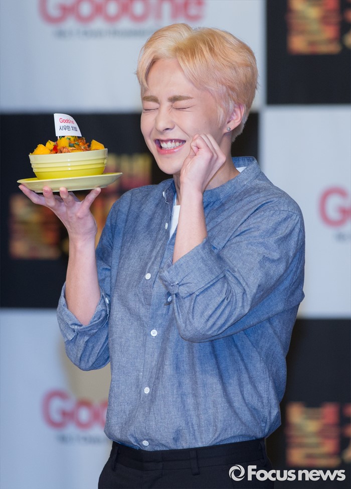 (서울=포커스뉴스) 29일 오후 서울 강남구 일지아트홀에서 열린 '굽네 볼케이노와 함께하는 엑소(EXO) 치밥 쿠킹 팬사인회'에서 시우민이 포즈를 취하고 있다.