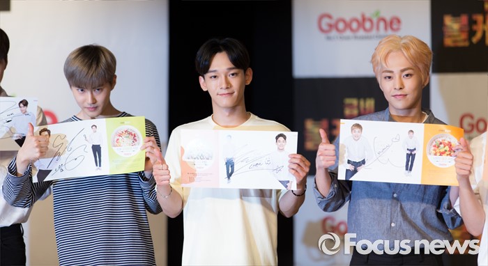 (서울=포커스뉴스) 29일 오후 서울 강남구 일지아트홀에서 열린 '굽네 볼케이노와 함께하는 엑소(EXO) 치밥 쿠킹 팬사인회'에서 수호(왼쪽부터), 첸, 시우민이 포즈를 취하고 있다.