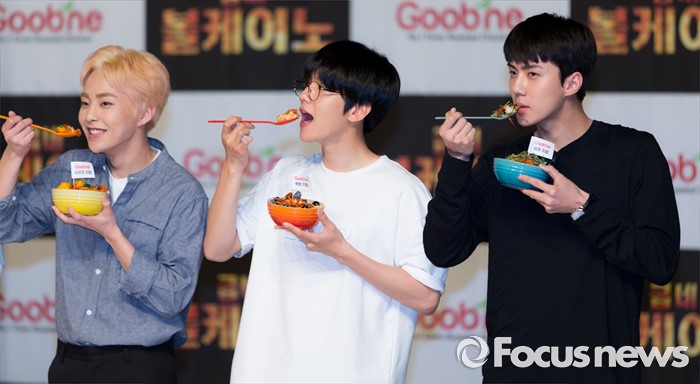 (서울=포커스뉴스) 29일 오후 서울 강남구 일지아트홀에서 열린 '굽네 볼케이노와 함께하는 엑소(EXO) 치밥 쿠킹 팬사인회'에서 시우민(왼쪽부터), 백현, 세훈이 포즈를 취하고 있다.