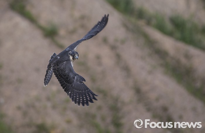 (인천=포커스뉴스)송골매 유조 수컷이 비행하다가 먹잇감을 발견하자 속도를 늦추고 방향을 바구고 있다.