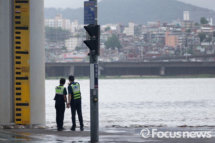 | △ 잠수교 수위 살펴보는 경찰들 |
