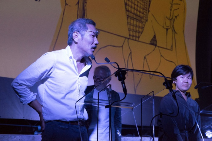 또 홍상수 감독이 마이크 앞에 서서 관객들과 이야기를 하고 있는 사진도 공개됐다. 양손을 뒤로 한 특유의 구부정한 모습이다. 여유로움이 묻어난다.