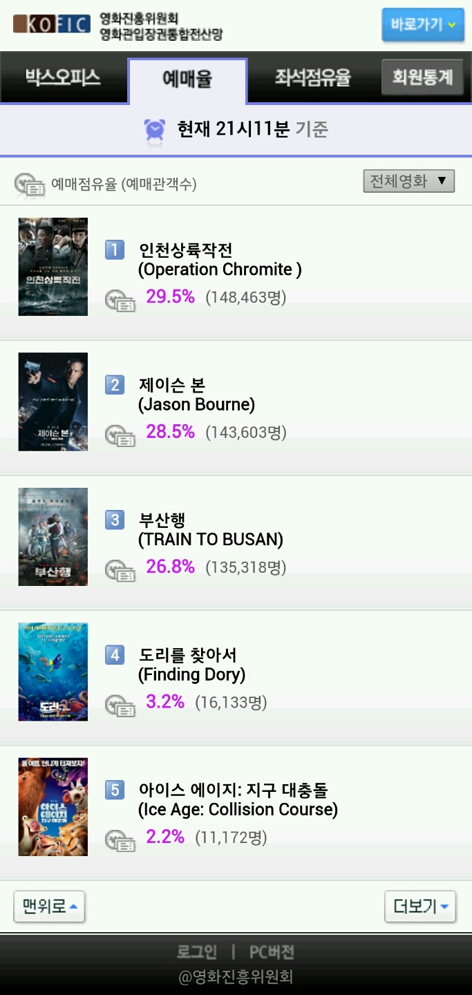 영화진흥위원회 영화관입장권통합전산망 집계에 따르면 '인천상륙작전'은 26일 오후 9시11분 기준 29.5%의 예매점유율로 1위를 차지했다.