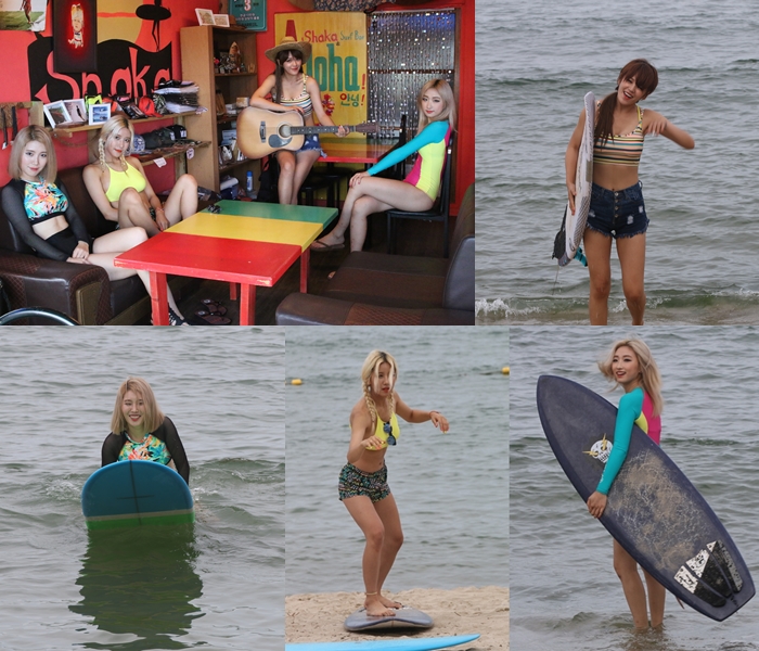 공개된 사진에는 서핑을 배우고 있는 솔티 멤버들의 모습이 담겨 있다. 또 한 장의 사진에는 서핑 후 한 카페에서 볼컴 수영복 등을 입고 자유로운 포즈로 휴식을 취하고 있는 멤버들의 모습이 담겨 있다.