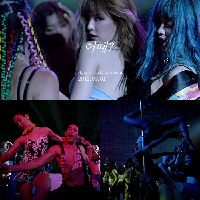 ‘어때’ 뮤직비디오는 클럽의 역동적 에너지를 표현하기 위해 실제 왁킹, 비보잉, 폴댄스, 룸바 등 다양한 전문 분야 댄서들과 다양한 국적의 보조 출연자들이 투입, 현아와 함께 퍼포먼스를 완성하는 거대한 스케일을 자랑할 예정이다.