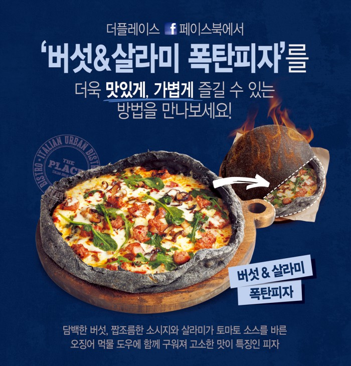첫번째 폭탄피자가 고르곤졸라, 그라나파다노 등 4가지 치즈를 사용하는 등 '풍미'를 강조했던 데 반해 두번째 폭탄피자는 버섯과 살라미를 풍성하게 얹어 담백하고 짭짤한 맛을 동시에 즐길 수 있다. 더플레이스에서 다양하게 판매 중인 맥주와도 잘 어울려 '피맥'(피자와 맥주)에도 안성맞춤이다.