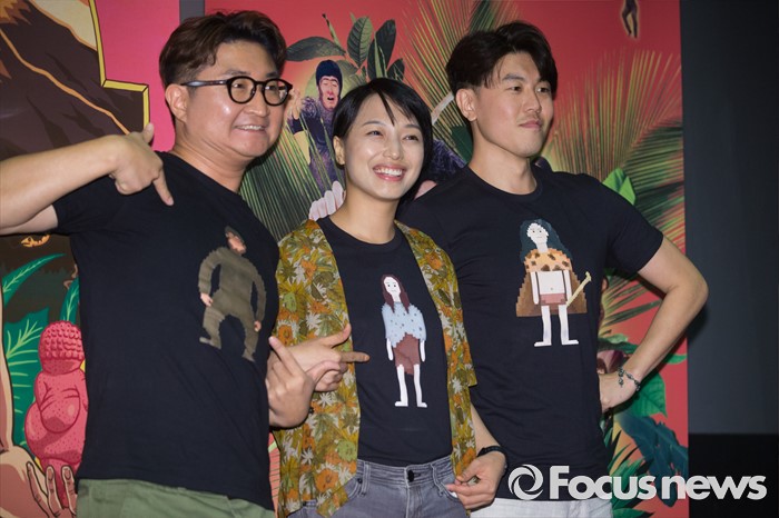 (서울=포커스뉴스) 9일 오후 서울 동작구 아트나인에서 열린 영화 '시발, 놈 : 인류의 시작' 언론시사회에백승기(왼쪽부터) 감독, 배우 김보리, 손이용이 포토타임을 갖고 있다.