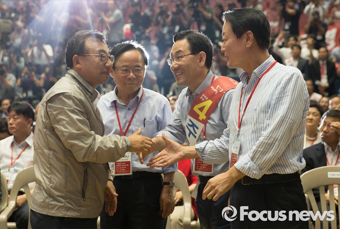 (서울=포커스뉴스) 9일 오후 서울 송파구 잠실실내체육관에서 열린 제4차 새누리당 전당대회에서 당대표로 선출된 이정현(왼쪽)이 한선교(오른쪽부터), 주호영, 이주영 후보들과 인사를 하고 있다.