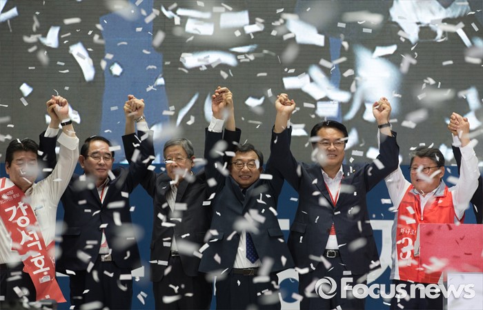 이부형 후보를 누르고 청년 최고위원으로 선출된 유창수 후보는 "청년에게 희망이 없으면 이 나라도, 정치도, 정당도 존재할 수 없다"며 "2000만 청년이 새누리당을 압도적으로 지지할 수 있도록 청년과 함께 숨쉬겠다"고 각오를 다졌다.서울 송파구 잠실실내체육관에서 열린 새누리당 4차 전당대회에 참석한 이정현 의원이 당대표로 선출된 후 김희옥 혁신비대위원장, 정진석 원내대표 등과 손을 들어 인사하고 있다. 2016.08.09 박동욱 기자