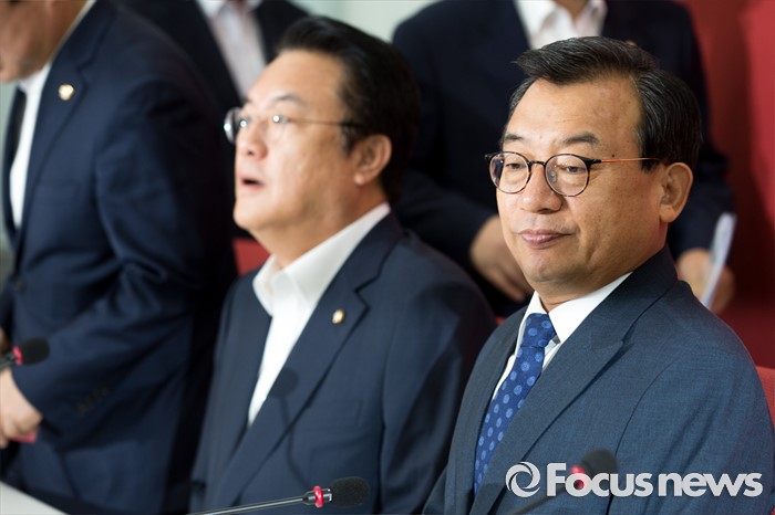 (서울=포커스뉴스) 이정현(오른쪽) 새누리당 대표와 정진석 원내대표가 11일 오전 서울 여의도 국회에서 열린 최고위원회의에 참석해 회의시작을 기다리고 있다. 이날 회의에서 대표와 원내대표를 비롯한 최고위원들의 모두발언 공개 없이 잠깐의 촬영시간만 주어진 뒤 비공개로 전환 했다.